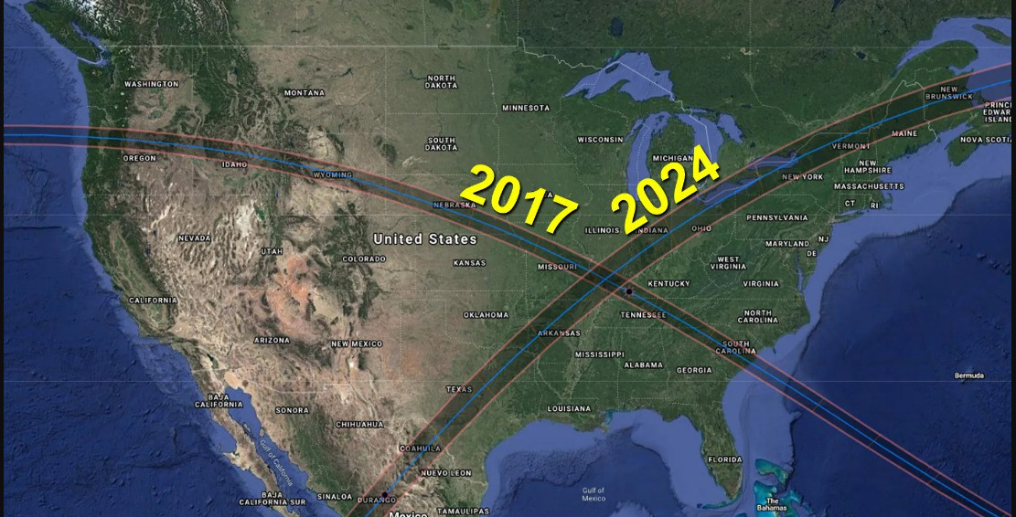 The paths of the 2017 and 2024 solar eclipses mark an X meaning the